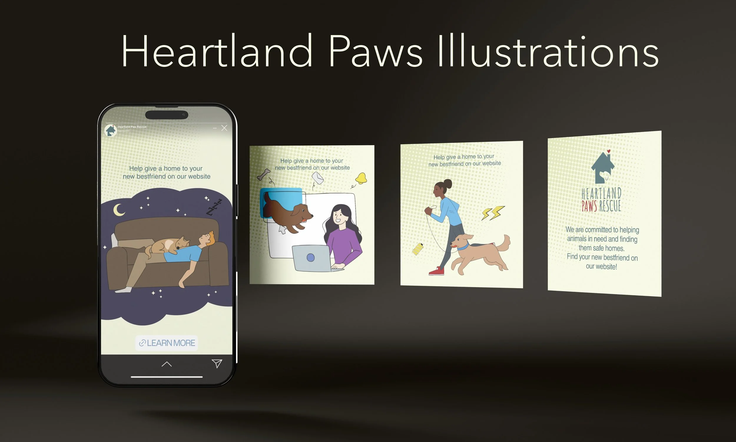 Heartland Paws Rescue is dedicated to rescuing, rehabilitating, and re-homing dogs in need. The objective of the brand is to raise awareness, increase adoptions, and boost donations. I designed a brand guide that included logos, illustrations, color palette, and more. I would later develop products such as dog food and a tote bag.