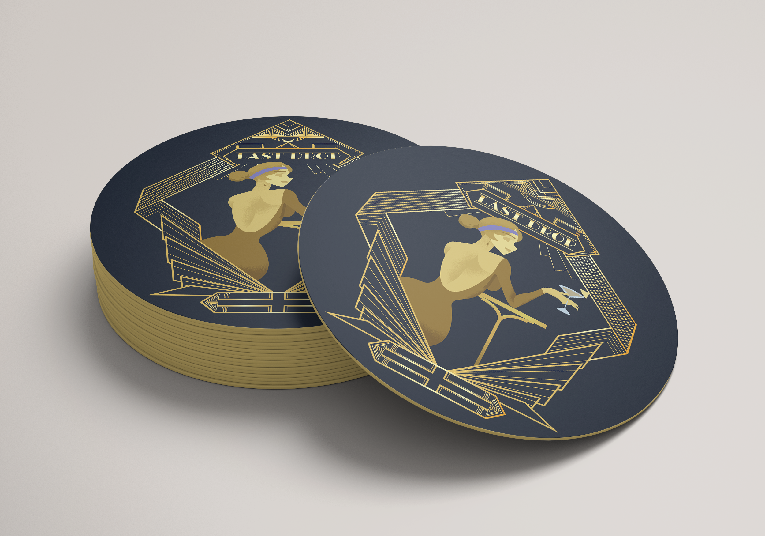 This project was to create as brand and t-shirt design that would be sold for a specific event. This design was made for The Last Drops grand opening. Influenced by Art Deco aesthetics, the design establishes a stylish and cohesive look. I also extended the branding across additional assets, including a custom glass, event poster, cocktail napkins, and coasters.